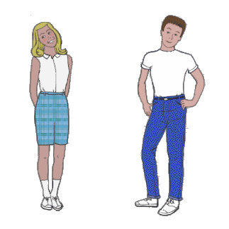 Jane's blouse and bermuda shorts constitute a suburban summer uniform. White Keds and bobby sox can (and should) be worn with almost anything. In winter the bermudas would turn into slacks, with the possible addition of a sweater.