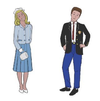 Jane is wearing a striped blazer with a permanently pleated solid skirt, made of denim in Arnel Triacetate-Cotton. White gloves are de riguer for church, weddings, graduations and funerals.