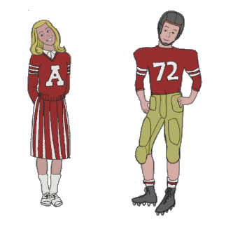 For boys football is a ticket to respect and popularity. It's lucky that Snavely is big for his age, because his lack of ball-handling skills assigns him to the line. But the other guys are beginning to pass him in size.Jane wears an Alum Falls High freshman cheerleader's outfit.