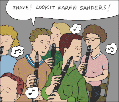 In band Jim Dickerson and I were sitting back in the clarinets and some of the senior girls were putting up signs for a pep rally.