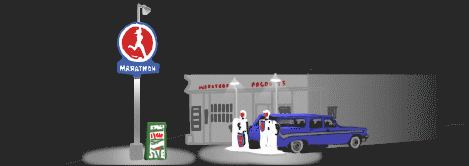 We headed for town, sometimes hitting 85 m.p.h. We stopped in the all night Marathon station at the corner of County Line Road and got 5 cents worth of kerosene for our lantern.