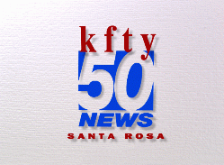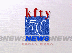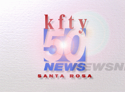 The letters in "KFTY" freeze in the cycling animated letters. Blue "News" type pops on. Gray news crawl continues.