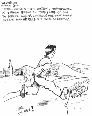 Abby always thought that he had hit his legs on the tail of his P-47 when he bailed out. Years later at a reunion he was told by a pilot who had been an eye-witness, "Impossible. Your ship's tail was completely shot away." The only other possibility was that the canopy closed on his legs as he jumped out.