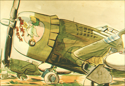 among enlisted men and officers alike. He had an enormous talent for art and maintained an extensive collection of drawings of fellow pilots which were remarkably accurate. He was also an accomplished caricaturist and cartoonist with a fertile imagination and mind. A pilot would tell Capt. Rarey something about himself, his likes, his interests, his dreams, and Capt. Rarey would come up with an insignia and nickname for him fitting him to a "T." Then he would transfer it in a painting on the nose of the pilot's P-47. Of all the aircraft art I witnessed, and I witnessed a lot, the work created by Capt. Rarey for the 379th Fighter Squadron was the most clever and professionally done. His own P-47 was named "Damon's Demon" and featured a caricature of a chubby bird of some unknown breed (lovingly called a "Rarey bird" by his fellow pilots) sitting atop an 8-ball, smoking a pipe in his very large bill, and holding a dripping