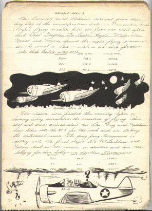 Capt. Johnson penned the daily logs in longhand and Rarey added illustrations as needed. The text on this page is as follows:"Lts. Donovan and Peterson returned from their long stay at the modification center in Evansville, Ind. Perfect flying weather held out from 0700 until after dark. Capt. Douglas, Lts. Liston, Bayle, McLachlan, Moist, and Myers opened the night flying season - so the worst is here - with a six-ship formation ride that lasted until 2230.