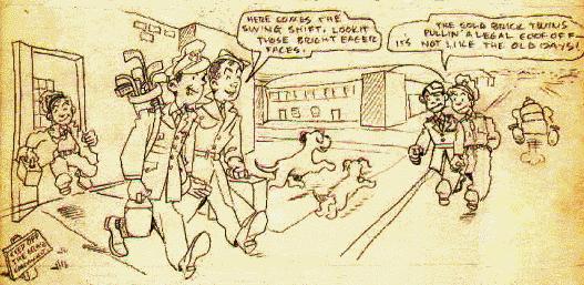 "Here comes the swing shift. Lookit those bright eager faces."