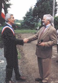 The ceremony immediately got under way. Here I am with the mayor of Villers-Bocage, who welcomed us, presented me with a small plaque, and introduced our friend Remy Chuinard. (Remy, it turned out, had engineered the entire ceremony. More about him later.) Remy gave a moving speech, first in French, then in English, followed by me reading some excerpts from my father's letters translated into French. By this time there was not a dry eye anywhere.