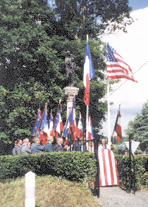 My father's P-47 went down a little way out of town. The town council decided to put their memorial to him about thirty yards from where his plane actually fell, because there, by the side of the country road, is a small shrine with a statue of the "Vierge Noire" (Black Virgin) that was erected in the 1930's. This photo shows the sight that greeted us as we drove up Sunday morning, June 7, 1999, the 55th anniversary of D-Day - the French and American colors flying beside the Black Virgin on her pedestal, a color guard of French veterans, and a stone draped in an American flag. Our friends and family were there, as well as a few dozen French people and a couple of French reporters.